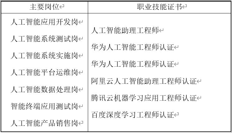 表1人工智能技术应用专业就业岗位及相关技能证书