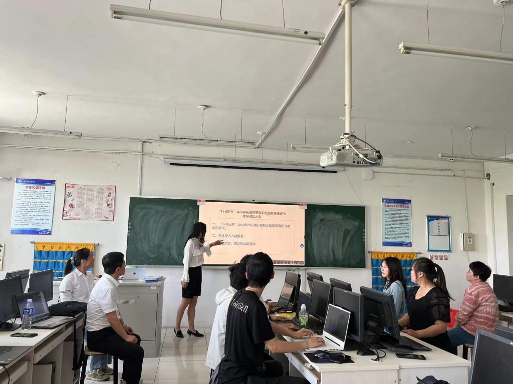 度试点方案》(教职成(2019)6号)文件精神,beat365中国官网软件技术专业与天津东软睿道教育信息技术有限公司合作,进行“1+X证书”职业教育培训评价组织,高效有序的推进JavaWeb应用开发职业技能等级证书试点工作。2023年5月31日,软件技术全体教师组织参加JavaWeb应用开发职业技能等级证书的考前动员活动。