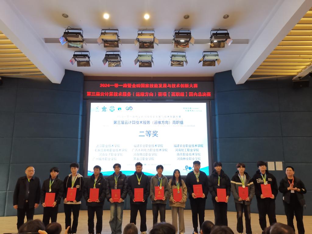 2024年11月29-30日,由金砖国家工商理事会中方理事会、“一带一路”暨金砖国家技能发展国际联盟、中国科协“一带一路”暨金砖国家技能发展与技术创新培训中心、教育部中外人文交流中心联合主办的一带一路暨金砖国家技能发展与技术创新大赛-第三届云计算技术服务(运维方向)赛项在四川职业技术学院顺利进行,来自全国的113支队伍同台竞技。经过激烈的角逐,beat365信息工程学院教师孙伟、王兰芹指导的由大数据技术专业学生孙昌国、林山组成的团队荣获二等奖。