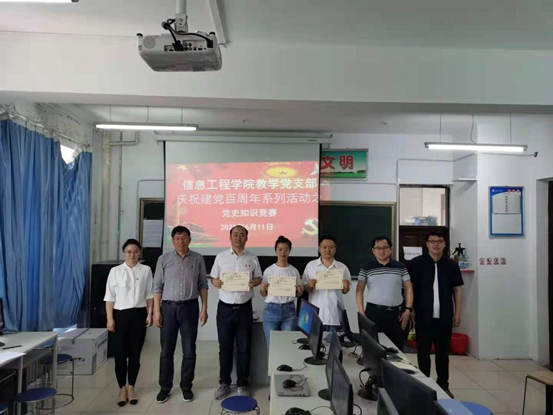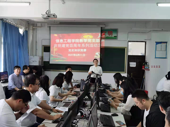 6月11日,为庆祝中国共产党成立100周年,学史明理、学史增信、学史崇德、学史力行,继承和弘扬爱党爱国精神,进一步增强教师团队学习党史的主动性和积极性,信息工程学院教学党支部举办了“庆祝建党百周年系列活动之党史知识竞赛”活动。信息工程学院院长金忠伟,书记王文焕,教学副院长卢凤伟,学管副院长张晓霖出席活动,教学党支部全体教师及部分党外群众参与活动。