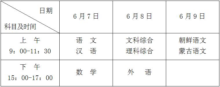 根据《教育部办公厅关于2018年普通高等学校招生全国统一考试全国统考科目时间安排的通知》(教学厅〔2018〕3号)和我省相关文件要求,黑龙江省2018年普通高等学校招生全统一考试考试科目时间安排如下:
